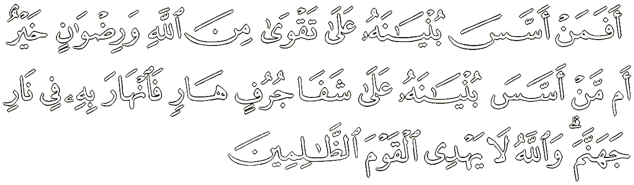 Lequel est plus méritant ? Est-ce celui qui a fondé son édifice sur la piété et l'agrément d'Allah, ou bien celui qui a placé les assises de sa construction sur le bord d'une falaise croulante et qui croula avec lui dans le feu de l'Enfer ? Et Allah ne guide pas les gens injustes.